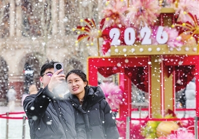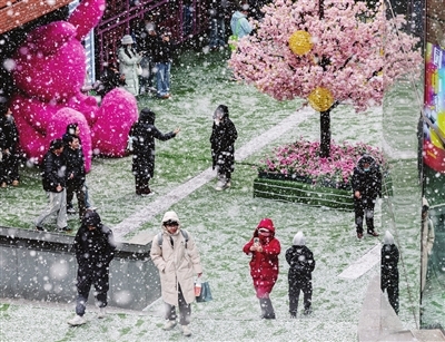 1月17日,我市迎来今年首场降雪。图为民园广场。